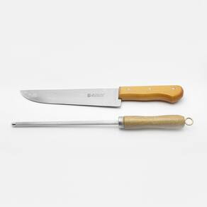Itens do conjunto: 1 bainha de couro modelo pantaneira; 1 Faca de aço carbono 1070 com 2mm de espessura, 8 polegadas de comprimento, cabos de madeira com três rebites reforçados, indicada para quem busca qualidade e durabilidade; 1 Chaira Afi-Corte Azevedo ranhurada e cromada com cabo de madeira 5/16x7, produzida em aço com banho de Cromo Duro, estriada longitudinal comprimento .