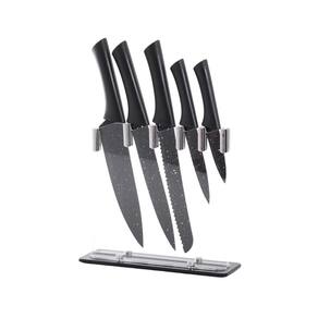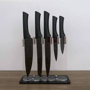 Conjunto De Facas com Suporte Gourmet - Preto Inox/Acrílico 6pç - Wincy Conjunto De Facas com Suporte Gourmet - Preto Inox/Acrílico 5pç - Wincy O conjunto de facas é o que faltava para deixar sua cozinha ainda mais bonita e moderna. Ele conta com um suporte para que você consiga deixar sua cozinha mais organizada. Caracteristicas do Produto: - Composição: Inox, polipropileno e acrílico; - Conteúdo: 1 Suporte e 5 facas; - Cor: Preto. Dimensões: - Suporte 23cm x 21cm; - 01 Faca do Chef 8 32cm x 4,2cm; - 01 Faca de pão 32cm x 2,8cm; - 01 Faca 832cm x 2,8cm; - 01 Faca para utilidades 21cm x 02cm; - 01 Faca para descascar 18cm x 02cm. 3 meses com o fabricante. Imagens meramente ilustrativas. Marca: Não Informado