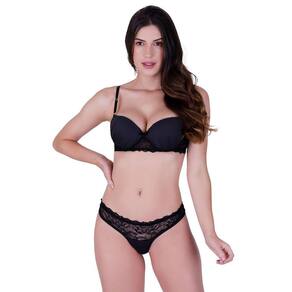 Conjunto fio sensual com bojo e arco em poliamida lisa e renda preto - Preto - M