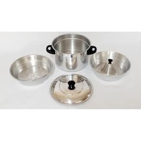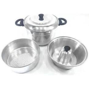 Conjunto forma pudim banho maria e panela de alumínio 3 x 1 Kit forma pudim banho maria e panela de alumínio reforçado 3 em 1 O kit forma banho maria 3x1 é ideal para fazer pudim, cuscuz e fazer cozimento a vapor. Os legumes ficam mais crocantes, mais saborosos e saudáveis pois ela mantém os valores nutritivos dos alimentos, mantendo sua cor e as vitaminas. Confeccionado em alumínio reforçado Alta durabilidade Produto testado e de qualidade O kit forma banho maria é composto por quatro peças de alumínio. 1 caçarola base; 1 forma de pudim bolo; 1 forma de cuscuz/ cozimento a vapor também escorredor ; 1 tampa. Obs: a forma de bolo ou pudim sobre põe a panela, fica acima da panela para cozimento banho maria. É indicado para fogão a gás, mas pode ser em fogão elétrico, não deixe acabar a água em caso de uso para banho maria. Envio 3x1 porque: 1 - somente a panela onde pode fazer o cuscuz ou outra receita 2 - banho maria que ela faz o pudim ou outra receita que utiliza banho maria 3 - forma que ela faz bolo / cuscuz Marca: Não Informado