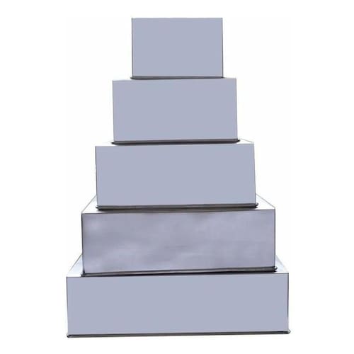 Conjunto de Forma Retangular com 5 peças Especifica para assar bolo , podendo assar em temperatura alta com designer moderno . 10 cm de altura . Podendo fazer um bolo com até 100 pedaços Medida 01 - 20x15x10 02 - 25x17x10 03 - 33x20x10 04 - 36x26x10 05 - 40x30x10