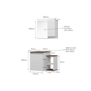- Gabinete: (L X A X P ) 60cm x 48cm x 42cm - Medida da Espelheira: (L X A X P ) 60cm x 48cm x 17,5cm - Peso Conjunto: 21,90 Kg
