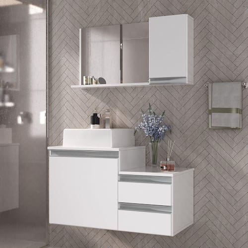Conjunto Gabinete Banheiro Cross 80 (gabinete+espelheira+cuba) Branco Inteiro - Blush