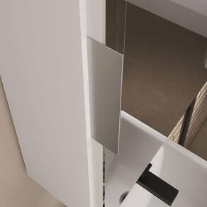 -Espelheira pode ter abertura da porta de ambos os lados. E só escolher a posição (porta abrindo para direita ou esquerda) na hora de fixar na parede.Os puxadores são únicas peças que vão soltas para fixação, pode-se escolher usá-los em diferentes posições da porta. Na foto anuncio estão centralizados. Mas pode deixar mais para direta ou esquerda. Dependendo da posição do gabinete na parede, pode escolher a melhor posição para atender na praticidade e design do mesmo.