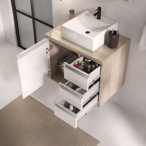 Conjunto Gabinete Banheiro Prisma 60cm - Gabinete + Cuba + Espelheira - Com Vidro Madeirado Branco - Blush