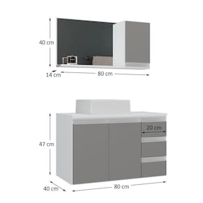 Conjunto Gabinete Banheiro Prisma 80cm Gabinete + Cuba + Espelheira Com Vidro Branco Cinza - Blush