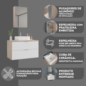 Conjunto Gabinete Banheiro Rubi 80cm - Gabinete + Cuba + Espelheira Madeirado Branco
