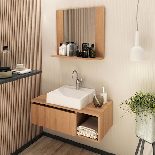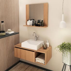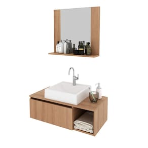 O Kit para Banheiro é a escolha ideal para transformar o seu espaço em um ambiente elegante e organizado. Com um design atual, ele oferece não apenas beleza, mas também funcionalidade, contribuindo para um banheiro agradável e útil. Produzido com materiais de alta qualidade, o kit garante durabilidade e resistência, criando um ambiente harmonioso e agradável para o seu dia a dia. CARACTERÍSTICAS TÉCNICAS: - Produzida em MDP de 15 mm - Acabamento UV na cor Amendôa - Acompanha Espelho - Cuba em Mármore Sintético - Porta Basculante com Dobradiça e Articulador - Balcão Suspenso - Puxador tipo Cava *Kit Composto por Gabinete Suspenso (3601), Espelheira (3610) e Cuba (3630) INFORMAÇÕES TÉCNICAS: 3601: Alt. 26,5 x Larg. 80 x Prof. 38,7 cm P. 10,8 kg 3610: Alt. 54 cm x Larg. 60 cm x Prof. 15,6 cm x P. 6,35 3630: Alt. 11,5 x Larg. 35 x Prof. 34 cm P. 5,5 kg INFORMAÇÕES ADICIONAIS: - ATENÇÃO: Não trabalhamos e não nos responsabilizamos pela montagem do móvel. Antes da montagem conferir se o produto está de acordo com o que comprou, produto montado e danificado pela montagem não será aceito troca. Montagem e instalação por conta do comprador. - As imagens ambientadas são meramente ilustrativas e podem apresentar itens que não compõe o produto. As cores do produto podem variar de acordo com o monitor, a iluminação do ambiente ou sua percepção visual. - Limpeza: Deve ser feita com pano macio e seco ou levemente. Não devem ser utilizados abrasivos como palha de aço e objetos cortantes. Garantia para defeitos de fabricação conforme Código de Defesa do Consumidor.
