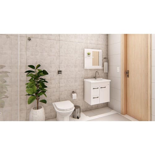 Possui uma composição integrada entre os padrões texturizados e madeirados, puxadores tipo alça e espelheiro que completam esse conjunto, tornando-o sofisticado e aconchegante, sem deixar de lado a praticidade e facilidade de montagem, que é característica dos produtos A. J. Rorato. Acabamento da Cuba: Gel Acabamento da Gaveta: Pintura Acabamento da Porta: Pintura Acabamento da Prateleira: Pintura Acompanha Cuba: Sim Acompanha Tampo: Sim Ambiente Principal: Banheiro Complexidade da Montagem: Baixa: pode ser montado por uma pessoa sozinha Cor: Branco Cor da Cuba: Gelo Cor do Produto: Branco Cor Interna: Branco Escala de Brilho: Semi-Fosco Escala de Brilho da Porta: Brilhante Escala de Brilho da Prateleira: Semi-Brilho Espessura do Espelho: 3 mm Formato do Espelho: Retangular Furação para Cuba e Torneira: Sim Gaveta com Chave: Não Itens Inclusos: 1 Kit Armário, 1 Espelheira, 1 Pia e Manual de Instalação Linha ou Coleção: Genova Manual de Especificação Técnica: https://cdn2.madeiramadeira.com.br/atributo/a-j-rorato-moveis/1370316-genova-tecnica.pdf Manual de Montagem e Instalação: https://cdn2.madeiramadeira.com.br/atributo/a-j-rorato-moveis/1370315-genova-instruCAo.pdf Material da Cuba: Mármore Sintético Material da Gaveta: MDF Material da Porta: MDF Material da Prateleira: MDF Material do Puxador da Gaveta: Plástico Material do Puxador da Porta: Plástico Material do Tampo: Mármore Sintético Material Principal: MDF Medida da Cuba (C x L x P): 58cmX34,5cmX14cm Medida da Espelheira (A x L x P): 53,5cmX55,4cm Medida do Gabinete (A x L x P): 53,5cmX55,4cmX33,5cm Necessita Montagem: Sim Origem do Produto: Nacional Peso: 20,044 kg Peso Máximo por Gaveta: 0,5 kg Peso Máximo por Prateleira: 0,2 kg Possui Espelheira: Sim Possui Gabinete: Sim Possui Gavetas: 02 Possui iluminação: Não Possui Pés: Suspenso Possui Portas: 01 Possui Rodízio: Não Recomendações de Uso, Manutenção e Limpeza: Nunca utilize esponja tipo bombril para a limpeza de seu armário e pia e nem produtos abrasivos, para limpeza utilize uma flanela limpa e seca. A exposição a luz solar pode modificar a cor único do produto. Sistema de Montagem: Parafuso Tamanho do Espelho (A x L): 53,5cmX55,4cm Tipo de Corrediça da Gaveta: Metálica Simples Tipo de Dobradiça/Corrediça da Porta: Metálica Tipo de Gabinete: Gabinete Suspenso Tipo de Porta: Bater Tipo de Puxador da Gaveta: Externo Tipo de Puxador da Porta: Externo