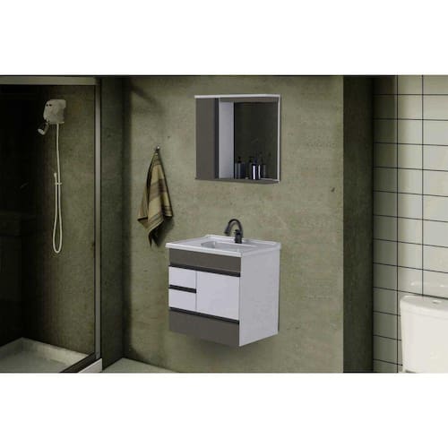 Possui uma composição integrada entre armário, espelheira e pia com design clean em linhas retas específico para o conjunto. suas portas e gavetas em BP madeirado, com cores da tendência, compõem um conjunto de armário, pia e espelheira. puxadores perfil em alumínio, corrediças e dobradiças de metal reforçado, lâmpadas de LED bivolt, que proporcionam iluminação uniforme no espelho, tornam o conjunto sofisticado e bonito. Acabamento da Cuba: Esmaltado Acabamento da Gaveta: BP Acabamento da Porta: BP Acabamento da Prateleira: Vidro Acompanha Cuba: Sim Acompanha Lâmpada: 01 Acompanha Tampo: Sim Ambiente Principal: Banheiro Complexidade da Montagem: Baixa: pode ser montado por uma pessoa sozinha Cor: Gianduia Cor da Cuba: Gelo Cor do Produto: Gianduia Cor Interna: Branco Escala de Brilho: Semi-Fosco Escala de Brilho da Gaveta: Semi-Fosco Escala de Brilho da Porta: Semi-Fosco Escala de Brilho da Prateleira: Semi-Fosco Espessura do Espelho: 3 mm Formato do Espelho: Quadrado Furação para Cuba e Torneira: Não Gaveta com Chave: Não Itens Inclusos: 1 Kit Armário, 1 Espelheira, 1 Pia e Manual de Instalação Linha ou Coleção: Modena Manual de Especificação Técnica: https://cdn2.madeiramadeira.com.br/atributo/a-j-rorato-moveis/1368715-71925-modena-5578-frente-e-verso.pdf Manual de Montagem e Instalação: https://cdn2.madeiramadeira.com.br/atributo/a-j-rorato-moveis/1368705-modena-instrucao.pdf Material da Cuba: Mármore Sintético Material da Gaveta: MDF/MDP Material da Porta: MDP Material da Prateleira: Vidro Material do Tampo: Mármore Material Principal: MDP Medida da Cuba (C x L x P): 83x45x15,5cm Medida da Espelheira (A x L x P): 57x57x15,5cm Medida do Gabinete (A x L x P): 58,5x57,5x42cm Necessita Montagem: Sim Origem do Produto: Nacional Peso: 38,23 kg Peso Máximo por Gaveta: 1 kg Peso Máximo por Prateleira: 0,2 kg Possui Espelheira: Sim Possui Gabinete: Sim Possui Gavetas: 02 Possui iluminação: Sim Possui Pés: Suspenso Possui Portas: 01 Possui Rodízio: Não Recomendações de Uso, Manutenção e Limpeza: Nunca utilize esponja tipo bombril para a limpeza de seu armário e pia e nem produtos abrasivos, para limpeza utilize uma flanela limpa e seca. A exposição a luz solar pode modificar a cor único do produto. Sistema de Montagem: Parafuso Tamanho do Espelho (A x L): 50,8x38cm Tipo de Corrediça da Gaveta: Metálica Simples Tipo de Dobradiça/Corrediça da Porta: Metálica Tipo de Gabinete: Gabinete Suspenso Tipo de Porta: Bater Tipo de Puxador da Gaveta: Embutido Tipo de Puxador da Porta: Embutido