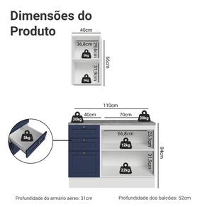 Com estrutura branca e frentes em azul, o acabamento é de alta resistência e possui textura suave ao toque, garantindo durabilidade por muito mais tempo. O destaque fica por conta dos puxadores ponto em ouro envelhecido, feitos em metal resistente, que adicionam personalidade e um charme único. O detalhe chanfrado das frentes forma molduras elegantes, inspiradas no estilo americano com um toque moderno.