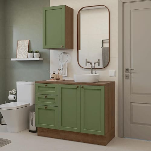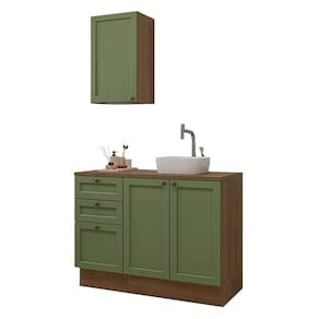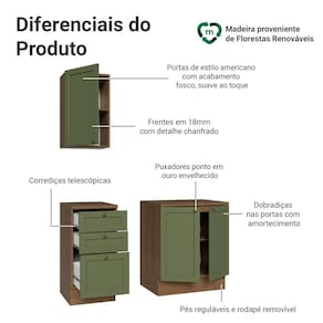 Com estrutura no tom amadeirado Rustic e frentes em Verde, o acabamento é de alta resistência e possui textura suave ao toque, garantindo durabilidade por muito mais tempo. O destaque fica por conta dos puxadores ponto em ouro envelhecido, feitos em metal resistente, que adicionam personalidade e um charme único. O detalhe chanfrado das frentes forma molduras elegantes, inspiradas no estilo americano com um toque moderno.