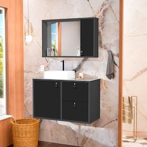 Puxadores pontuais em couro dão o toque final de sofisticação a esse lindo conjunto. Acabamento da Cuba: Polido Acabamento da Gaveta: Pintura UV Acabamento da Porta: Pintura UV Acompanha Cuba: Sim Acompanha Manual de Instalação: Sim Acompanha Parafusos Para Fixação Na Parede: Sim Acompanha Tampo: Sim Altura do Espelho: 45 cm Ambiente Principal: Banheiro codigo_ean: 7909903663165 Cor: Grafite / Preto Fosco Cor da Cuba: Branco Cor do Produto: Grafite / Preto Fosco Cor Interna: Grafite Escala de Brilho: Fosco Escala de Brilho da Gaveta: Fosco Escala de Brilho da Porta: Fosco Espessura do Espelho: 3 mm Formato do Espelho: Retangular Furação para Cuba e Torneira: Sim Gaveta com Chave: Não Itens Inclusos: Gabinete, Cuba, Espelheira com Armário, Puxadores, Itens para fixação Largura do Espelho: 54 cm Linha ou Coleção: CONJUNTO TORO 80 CM C/ VIDRO Manual de Montagem e Instalação: https://product-hub-prd.madeiramadeira.com.br/905937/documents/de730e76-912c-49fa-8b36-e8502a0fc24022manualinstalacaocasanova.pdf Material da Cuba: Mármore Sintético Material da Gaveta: MDF Material da Porta: MDF Material do Puxador da Gaveta: Couro Material do Puxador da Porta: Couro Material do Tampo: Vidro Material Principal: MDF Medida da Cuba (C x L x P): 38 x 30 x 11 cm Medida da Espelheira (A x L x P): 47 x 76 x 12,5 cm Medida do Gabinete (A x L x P): 51,5 x 80 x 35 cm Necessita Montagem: Não Origem do Produto: Nacional Peso: 33,3 kg Peso Máximo por Gaveta: 2 kg Possui Espelheira: Sim Possui Gabinete: Sim Possui iluminação: Não Possui Nichos: Não Possui Pés: Não Possui Porta de Vidro: Não Possui Recorte No Tampo Para Cuba: Não Possui Recorte No Tampo Para Misturador: Não Possui Rodízio: Não Possui Sifão: Não Possui Tampo: Sim Produto Montado: Sim Recomendações de Uso, Manutenção e Limpeza: Limpeza com pano úmido Suporta Até (kg): 10 kg Suporte para Toalheiro: Não Tamanho do Espelho (A x L): 45 x 54 cm Tipo de Corrediça da Gaveta: Metálica Telescópica Tipo de Dobradiça/Corrediça da Porta: Metálica Tipo de Fixação do Espelho: Parafusos Tipo de Porta: Abrir Tipo de Puxador da Gaveta: Externo Tipo de Puxador da Porta: Externo Válvula indicada: Válvula padrão