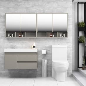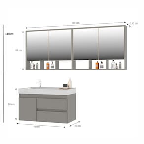 O conjunto Floripa cheio de beleza e a qualidade do 100% MDF, e acabamento em bordas de PVC, foi desenvolvido para quem procura por mais espaço, organização e praticidade. Um gabinete suspenso com 80cm de largura, composto por duas gavetas que deslizam suavemente e uma porta com fechamento soft, não bate. O charme desse conjunto se completa com as espelheiras, tendo 160cm de largura, as portas de abrir com espelhos grandes, e dobradiças que fazem as portas fecharem suavemente, na parte interna tem prateleiras que contribuem para melhor organização armazenagem dos seus itens. Na parte inferior, composta com nichos que podem ser utilizados até mesmo para compor uma bela decoração. Acabamento da Cuba: Polido Acabamento da Gaveta: PVC Acabamento da Porta: PVC Acabamento da Prateleira: PVC Acompanha Cuba: Sim Acompanha Manual de Instalação: Sim Acompanha Parafusos Para Fixação Na Parede: Não Acompanha Tampo: Sim Acompanha Válvula: Não Ambiente Principal: Banheiro codigo_ean: 7900288226068 Cor: Cimento Cor da Cuba: Branco Cor do Produto: Cimento Escala de Brilho: Fosco Escala de Brilho da Porta: Fosco Escala de Brilho da Prateleira: Fosco Espessura do Espelho: 3 mm Formato do Espelho: Quadrado Formato Espelheira: Quadrado Furação para Cuba e Torneira: Sim Gaveta com Chave: Não Itens Inclusos: 1 Balcão e 1 Espelheira Linha ou Coleção: Floripa Manual de Montagem e Instalação: https://product-hub-prd.madeiramadeira.com.br/349276659/documents/1038ed5f-d479-4d90-971a-f544d9e87c143194446566517575341874242.pdf Marca: Belizze Material da Cuba: Mármore Sintético Material da Gaveta: MDF Material da Porta: MDF Material da Prateleira: MDF Material do Tampo: Mármore Sintético Material Principal: MDF Medida da Cuba (C x L x P): 7 x 40 x 78,5 Medida da Espelheira (A x L x P): 68x160x12 Medida do Gabinete (A x L x P): 50x79x40 Necessita Montagem: Não Origem do Produto: Nacional Peso: 47,8 kg Peso Máximo por Gaveta: 20 kg Peso Máximo por Prateleira: 10 kg Possui Espelheira: Sim Possui Gabinete: Sim Possui iluminação: Não Possui Nichos: Não Possui Pés: Suspenso Possui Rodízio: Não Possui Sifão: Não Possui Tampo: Sim Possui Tampo de Vidro: Não Produto Montado: Não Quantidade de Espelhos: 04 Espelhos com Tamanhos Iguais Recomendações de Uso, Manutenção e Limpeza: Retire o pó com uma flanela seca e depois utilize um pano macio umedecido com água. Não utilizar produtos químicos e abrasivos. Suporte para Toalheiro: Não Tamanho do Espelho (A x L): 58x80 Tamanho do Gabinete: Médio: de 60cm a 80cm de largura Tipo de Corrediça da Gaveta: Metálica Telescópica Tipo de Cuba: Embutir Tipo de Dobradiça/Corrediça da Porta: Com Amortecedor Tipo de Fixação do Espelho: Fita Dupla Face Tipo de Gabinete: Gabinete Suspenso Tipo de Porta: Abrir Tipo de Puxador da Gaveta: Não Possui Tipo de Puxador da Porta: Não Contém Válvula indicada: Não