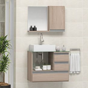KIT BANHEIRO COMPLETO 60CM -GABINETE + CUBA + ESPELHEIRA + TAMPO VIDRO INCOLOR