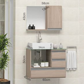 Modelo moderno, com puxador de alumínio tipo perfil. (móveis iguais sob medida)Medidas gabinete: 60cm x 40cm x 50 (comp. / prof. / altura)Medidas da pia sobrepor : 34x34x11Medidas Espelheira : 60cm x 40cm x 14cm (comp. / altura / prof)Medida Tampo Vidro: 60cm x 40cm com 6mm de espessura (vidro temperado)