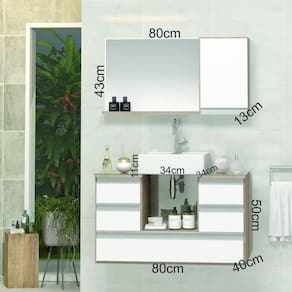 Modelo moderno, com puxador de alumínio tipo perfil. (móveis iguais sob medida)Medidas gabinete: 80cm x 40cm x 50 (comp. / prof. / altura)Medidas da pia sobrepor : 34x34x11Medidas Espelheira : 80cm x 40cm x 14cm (comp. / altura / prof)Medida Tampo Vidro: 80cm x 40cm com 6mm de espessura (vidro temperado)