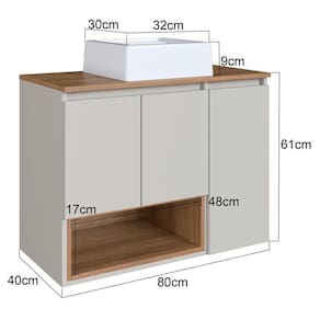 Características adicionais: Tampo em MDP 15mm, amplo espaço interno, nicho externo de acesso fácil, dobradiças metálicas, cuba em mármore sintético