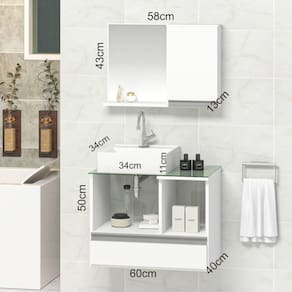 Modelo moderno, com puxador de alumínio tipo perfil. (igual móveis sob medida)Medidas gabinete: 60cm x 40cm x 50 (comp. / prof. / altura)Medidas da pia sobrepor : 34x34x11Medidas Espelheira : 60cm x 40cm x 14cm (comp. / altura / prof)Medida Tampo Vidro: 60cm x 40cm com 6mm espessura (vidro temperado)