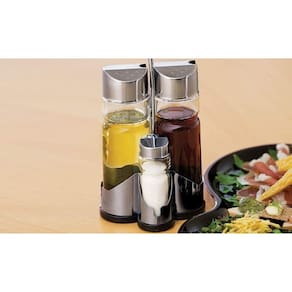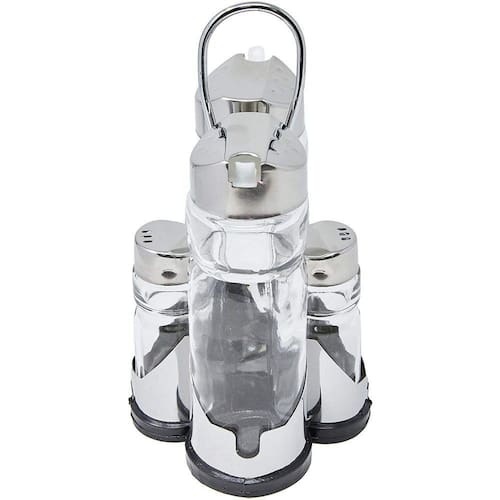 DESCRIÇÃO Conjunto galheteiro com suporte 05 peças. Contém:01 azeiteiro, 01 vinagreiro, 01 saleiro, 01 pimenteiro e 01 suporte. Matéria prima:Vidro, aço inox e PP. Medida aproximada da embalagem: (Compr. X Larg. X Alt.):10x10x21 cm.