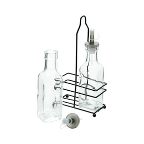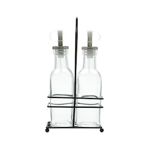 Características: Material de Qualidade: Feito em vidro de alta qualidade e suporte de metal preto, garante durabilidade e resistência para um uso constante e seguro. Design Elegante: Com um acabamento elegante em preto, o conjunto adiciona um toque de sofisticação à sua mesa, combinando com qualquer decoração. Versatilidade: Contém uma garrafa para vinagre e outra para azeite de 200ml cada, além de um suporte prático para mantê-las organizadas e ao alcance das mãos. Dimensões Ideais: Com medidas de 6,5x12x23 cm (CxLxA), as garrafas têm o tamanho perfeito para serem utilizadas com comodidade e sem ocupar muito espaço.