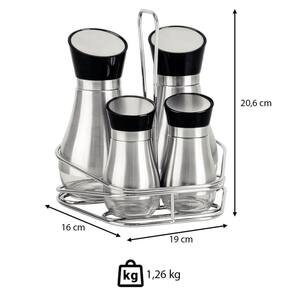 - São quatro galheteiros projetados especialmente para azeite, vinagre, sal e pimenta, todos desenvolvidos em vidro com revestimento em aço inox e tampas em ABS de alta vedação em silicone, que garantem não apenas a sua durabilidade, mas também a de seu conteúdo.