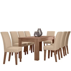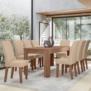 O conjunto Grecia destaca-se pela impressão dos detalhes amadeirados, replicando um design clean e despojado, dando um toque de modernidade ao ambiente e deixando o espaço das refeições ainda mais charmoso. Os acabamentos oferecem maior qualidade e durabilidade ao móvel. Medida da Mesa (A x L x P): 79 x 84 x 185 Peso da Mesa: 40.42 Mesa suporta até: 120 Acabamento da Cadeira/Banco: Pintura Texturizada Acabamento da Mesa: Pintura Texturizada Almofada do assento: Fixa Altura do Conjunto: 99 Ambiente Principal: Sala de Jantar Cadeira/Banco estofada: Encosto e Assento Estofados Cadeira/Banco suporta até: 120 Complexidade da Montagem: Média: pode ser montado por mais de uma pessoa e/ou necessite de maior conhecimento para montagem Cor: Amendoa/51C Cor da Base: Marrom Cor do Produto: Amêndoa/51C Cor do Tampo: Marrom Cor Flex: Não Cor Secundária: Marrom De Canto (Canto Alemão): Não Design da Base: 4 Pés Enchimento do Assento: Espuma D-12 Enchimento do Encosto: Espuma D-12 Escala de Brilho: Fosco Espessura do Tampo: 25 Estrutura do Assento: MDF/ESPUMA Estrutura do Encosto: MDF Formato do Tampo: Retangular Itens Inclusos: 1 Mesa, 8 Cadeiras,Kit Ferragem, Manual de Montagem Linha ou Coleção: Grecia Manual de Montagem e Instalação: https://cdn2.madeiramadeira.com.br/atributo/celta-moveis/1361313-manual-conjunto-grecia.pdf Material da Base da Mesa: MDF Material da Estrutura da Cadeira: MDF Material do Tampo: MDP Medida da Cadeira/Banco (A x L x P): 99 x 41,5 x 48 Medida do Tampo (L x C x E): 84 x 185 x 2,5 Mesa Extensível: Não Montagem Flex: Não Necessita Montagem: Sim Origem do Produto: Nacional Peso da Cadeira/Banco: 9.231 Possui Apoio para Braços: Não Possui Apoio Para os Pés: Não Possui Suporte Giratório: Não Quantidade de Lugares: 08 Recomendações de Uso, Manutenção e Limpeza: Limpeza com pano umedecido. Revestimento da Cadeira/Banco: Linho Sistema de Montagem: Parafusos