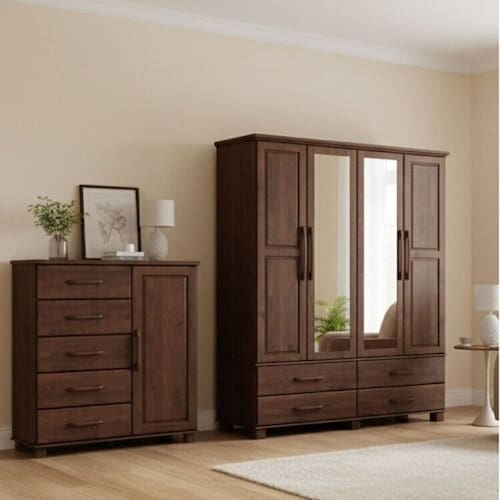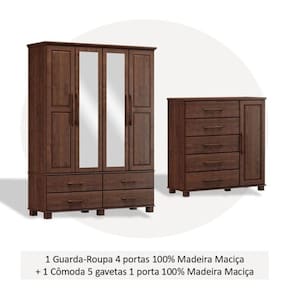 1x Guarda-Roupa Bipartido 4 Portas 4 Gavetas 100% Madeira Maciça Linha Ouro Café Largura: 167,6 cm Altura: 220 cm Peso: 104 kg Profundidade: 55,5 cm Necessita Montagem: Sim