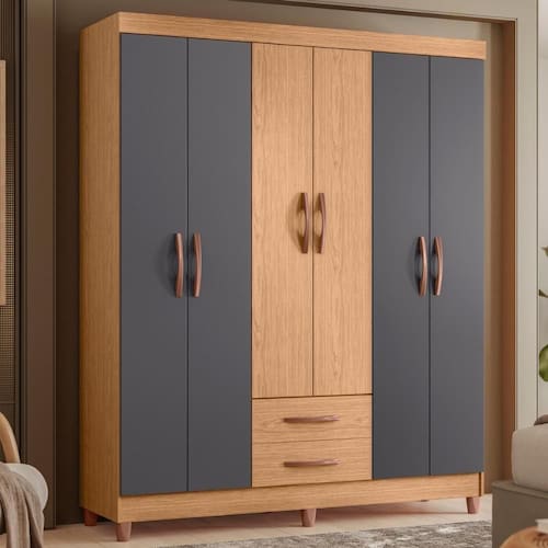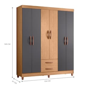 O guarda roupa dispõe quatro prateleiras para organizar travesseiros, cobertores, toalhas e objetos.