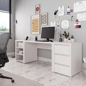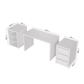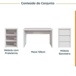 Com um design minimalista e elegante, o Conjunto Home Office Ficus foi projetada para permitir que você crie diferentes configurações para atender às suas necessidades de espaço e organização combinando este móvel com outros da linha Ficus. Seja para um escritório em casa ou para uma empresa, esta peça irá adicionar um toque de sofisticação e funcionalidade ao seu ambiente de trabalho. Esta linha foi desenvolvida com uma técnica especial que consiste em unir várias camadas de MDF de alta qualidade, formando um painel leve porém resistente e com aparência robusta de 37mm de espessura, conhecido como tamburato. O acabamento das chapas é em BP com fitas de borda em PVC que conferem ainda mais durabilidade e resistência à umidade para o móvel. Possui também sapatas niveladoras que possibilitam o correto ajuste do móvel em qualquer piso. Possui Portas: Não Acabamento: BP Suporta Até (kg): 35 kg Possui Rodízio: Não Altura do Conjunto: 75.6 cm Ambiente: null Ambiente Principal: Escritório Cor: Branco Informação Complementar: 1x Escrivaninha Reta Modular Ficus 1,20m BrancoLargura: 120 cmAltura: 74,1 cmPeso: 28,33 kgProfundidade: 59,8 cmNecessita Montagem: Sim1x Gaveteiro Modular 50cm Ficus BrancoLargura: 50 cmAltura: 75,6 cmPeso: 29,2 kgProfundidade: 59,8 cmNecessita Montagem: Sim1x Nicho Modular 2 Prateleiras Ficus BrancoLargura: 50 cmAltura: 75,6 cmPeso: 26,3 kgProfundidade: 59,8 cmNecessita Montagem: Sim