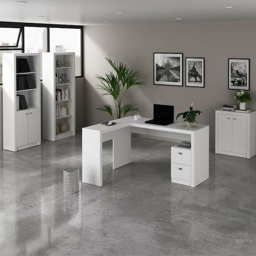 Os produtos Tecno Mobili são feitos em MDP, material muito forte e de alta durabilidade, garantindo aos produtos excelente estabilidade e resistência. Possui revestimento melamínico em baixa pressão, também conhecido como BP, que é um acabamento que faz com que o produto tenha maior resistência e durabilidade, ou seja, não descasca, é mais resistente a riscos e possui maior resistência à umidade. O conjunto possui as seguintes medidas: Medidas Estante 4 Prateleiras ME4104: Altura 171,5cm, Largura 60cm, Profundidade 31,5cm Medidas Balcão 2 Portas ME4103: Altura 74,5cm, Largura 60cm, Profundidade 31,5cm Medidas Escrivaninha ME4129: Altura 74,5cm, Largura 135,8cm, Profundidade 113cm Medidas Estante com Armário ME4110: Altura 171,5cm, Largura 60cm, Profundidade 31,5cm