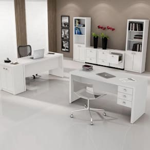 O conjunto Home Office da Tecno Mobili possui 8 peças possui balcão 2 portas ME4103, 2 mesas 3 gavetas ME4113, 2 estantes 3 prateleiras e 2 portas ME4110 e 3 gaveteiros ME4112. Os produtos Tecno Mobili são feitos em MDP, material muito forte e de alta durabilidade, garantindo aos produtos excelente estabilidade e resistência. Possui revestimento melamínico em baixa pressão, também conhecido como BP, que é um acabamento que faz com que o produto tenha maior resistência e durabilidade, ou seja, não descasca, é mais resistente a riscos e possui maior resistência à umidade.