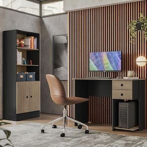 Conjunto Home Office Com Armário 2 Portas E Mesa Escrivaninha Preto/carvalho - Qmovi Preto/carvalho Conjunto Home Office com Armário 2 Portas e Mesa Escrivaninha - Qmovi O Conjunto Home Office é formado por um Armário e uma Mesa Escrivaninha possuem design compacto e ergonômico. O Armário foi produzido em MDP e conta com 2 portas com puxadores em furo, é um móvel multifuncional. A Mesa Escrivaninha ajuda na otimização do espaço e promove o conforto necessário para acompanhar os momentos de trabalho e aprendizado, possui 1 prateleira elevada para o CPU e 2 gavetas para melhor organizar seus objetos. Armário Gamer 2 Portas - Qmovi - Estrutura em MDP - Pintura UV - 2 Portas - Dobradiças metálicas - Puxadores em furo - Móvel multifuncional - Ideal para livros e objetos decorativos