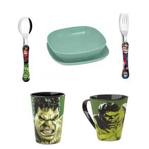 Conjunto HULK Faqueiro 2 peças Avengers Copo Caneca Pratos Faqueiro com 2 peças com o tema Vingadores - Avengers mai copo e caneca Hulk Linha Tematica Composto por: 1 colher de mesa 1 garfo de mesa