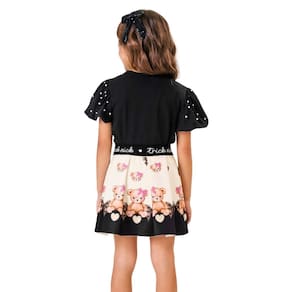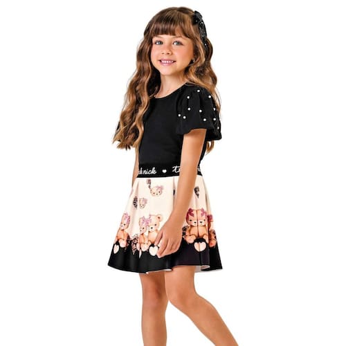 Em um mix de delicadeza e estilo, o Conjunto Infantil TrickNick traz uma blusa em cotton com mangas balonê e aplicação de pérolas, unindo conforto e sofisticação aos looks das pequenas. A saia em ponto roma recebe estampa sublimada de ursinhos, ganhou cós em elástico personalizado e shorts interno, garantindo praticidade e liberdade para brincar sem preocupações. Perfeito para festas, passeios ou um dia divertido na escola.