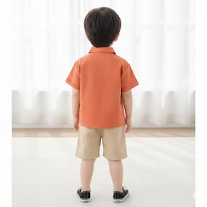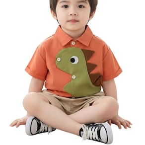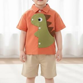 Composto por camisa social de manga curta com uma divertida aplicação em formato de dinossauro, e uma bermuda leve em tom bege, o conjunto combina charme e praticidade.
