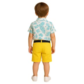 Conjunto Infantil Camisa Floral e Bermuda Azul  Amarelo Social é ideal para ocasiões especiais e dias quentes. A camisa de manga curta tem estampa floral tropical em azul e branco, com botões frontais, perfeita para eventos formais com toque leve. A bermuda  Amarelo e azul social acompanha cinto embutido, oferecendo um visual elegante e confortável.