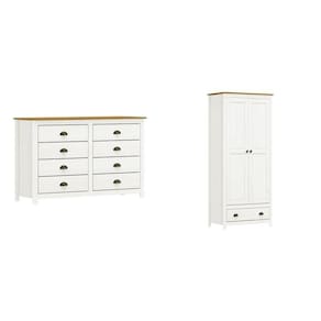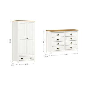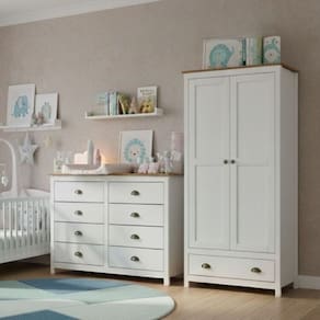 O Conjunto Topázio da Finestra Móveis é composto pelo Guarda-Roupa 2 Portas 1 Gaveta e a Cômoda 8 Gavetas, ambos produzidos em madeira maciça de pinus com acabamento em verniz PU/UV acetinado. O guarda-roupa conta com prateleiras, cabideiro metálico e gaveta com corrediças telescópicas, oferecendo organização prática para roupas e acessórios. Já a cômoda, com oito gavetas espaçosas e puxadores metálicos, é ideal para otimizar o armazenamento com elegância. Um conjunto que une funcionalidade, durabilidade e design sofisticado, perfeito para deixar o quarto aconchegante e bem organizado. Suporta Até (kg): 70 kg Possui Rodízio: Não Altura do Conjunto: 185.5 cm Ambiente: null Ambiente Principal: Quarto Infantil Cor: Branco/Freijó Informação Complementar: 1x Cômoda 8 Gavetas Topázio 100% Madeira Maciça para Quarto Branco /Freijó Largura: 125 cm Altura: 85 cm Peso: 35 kg Profundidade: 41 cm Necessita Montagem: Sim