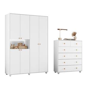 O guarda-roupa conta com 2 gavetas com corrediças telescópicas, puxadores em ABS com acabamento metalizado dourado, nicho central com iluminação em fita de LED que valoriza a decoração, dobradiças de 3,5cm com sistema slow motion, cabideiros em alumínio resistentes e pés inclusos.