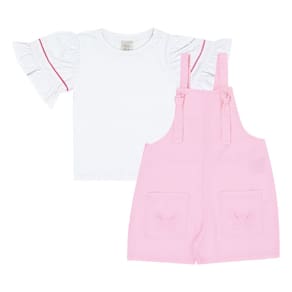Versátil, estiloso e charmoso para as fashionistas de plantão! Conjunto jardineira composto por uma jardineira em sarja na cor chiclete com bolsos frontais, fechamento da peça em amaração nas alças acompanha blusa meia malha na cor branca. Um charme!