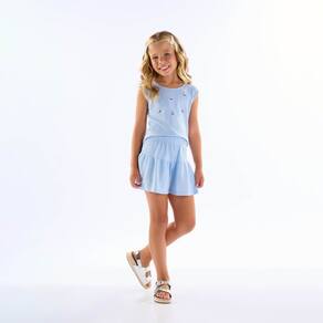 O dia de calor pede um look charmoso e fresquinho para curtir um passeio com a vovó! Conjunto composto por blusa e short meia malha na cor hortênsia. A blusa possuí estampa bordada de flores com strass e o short possuí elastano na cintura para maior conforto e movimentação.