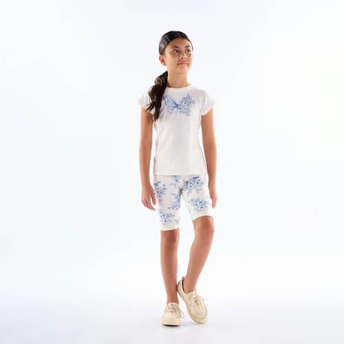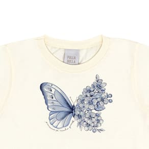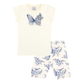 Look ideal para brincar, pular e aproveitar o dia quente e ensolarado! Conjunto charmoso e cheio de estilo para as amantes de borboletas e flores, composto por blusa meia malha na cor off white com estampa de borboleta com flores em strass e bermuda ciclista em cotton leve com estampa digital azul de broboleta com flores. Sua fashionista irá adorar!