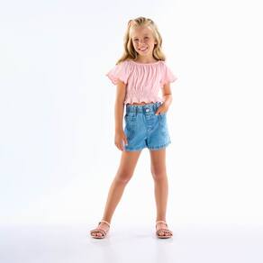 Conjunto perfeito para dias ensolarados! Composto por blusa meia malha na cor rosê, mangas curtas, bordado diferenciado nas mangas e elástico franzido na cintura deixando a peça ainda mais charmosa e perfeita para os dias quentes. Já o short jeans índigo médio possuí elastano na cintura, bolsos funcionais e fechamento em botão frontal.