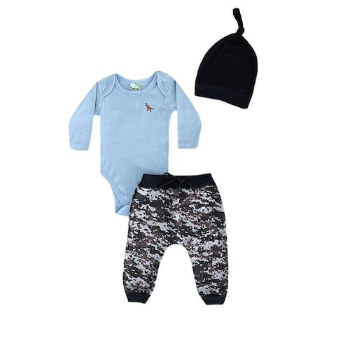 Nosso Conjunto Infantil Menino Body Cinza + Calça Camuflada e Touca - Lumagy é a coisa mais fofa desse mundo! O conjunto contém 1 body cinza com aplicação de dinossauro, onde conta com botões de pressão entre pernas que facilitam na hora da troca; 1 calça camuflada super estilosa; e para completar o look, acompanha também uma touca muito linda! As cores casam entre si, fazendo o composê perfeito.