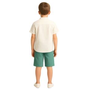 Nada mais prático e estiloso para o dia a dia do que um conjunto infantil que une conforto e charme. A camisa gola padre, em tom off-white, tem modelagem reta, bolso funcional no peito e fechamento por botões de madeira natural, conferindo toque artesanal ao look. A bermuda verde, de cintura elástica com cordão ajustável e corte até o joelho, oferece liberdade total para corridas, pulos e outras aventuras.