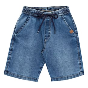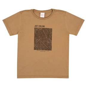 Praticidade para seu menino ficar ainda mais estiloso. Conjunto composto por camiseta meia malha na cor caramelo com gola reforçada e estampa frontal com escrita "relaxando, aproveitando a beleza da natureza, vibrações do verão". Já a bermuda na cor índigo médio jeans leve possuí elastano, bolsos funcionais e cadarços decorativos.
