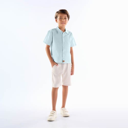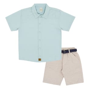 Conjunto ideal para uma festa, passei ou momento especial que pede por um look arrumadinho. Composto por camisa tricoline na cor céu e abertura frontal com botões. Já a bermuda em tecido eco na cor cáqui possuí bolsos funcionais e cinto.