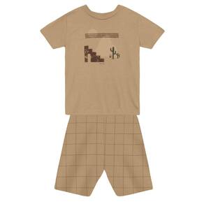Deixe seu pequeno estiloso e confortável com o conjunto infantil masculino da Mundi! Composto por uma camiseta em meia malha com estampa frontal divertida, e uma bermuda em ribana aurora quadriculada, este conjunto é ideal para os dias de brincadeira. A bermuda possui cós elástico, garantindo liberdade de movimento. Perfeito para compor looks descontraídos, esse conjunto é a escolha ideal para pais que valorizam qualidade e estilo na moda infantil.