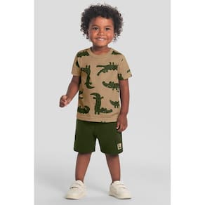Deixe seu bebê ainda mais estiloso com o encantador conjunto infantil da Brandili! Composto por uma camiseta em meia malha, apresenta uma divertida estampa de jacaré, perfeita para os pequenos aventureiros. A bermuda em moletinho, de cor lisa, traz um detalhe de aplique termocolante que complementa o visual. Ideal para dias quentes, esse conjunto garante conforto e liberdade de movimento. Combine com tênis e um boné para um look despojado e cheio de charme!