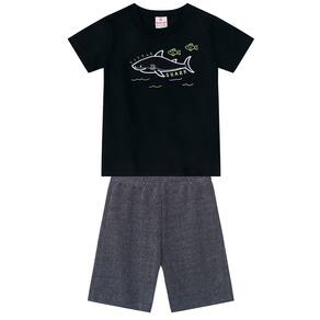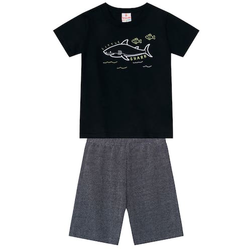 Encante seu pequeno explorador com o conjunto infantil menino composto por camiseta e bermuda. A camiseta confeccionada em malha conta com gola redonda, mangas curtas e estampa frontal com aplique com enchimento, já a bermuda confeccionada em moletinho jeans possui cor lisa e elástico no cós. Ideal para o dia a dia do pequeno. Tradução: "Pequeno tubarão."
